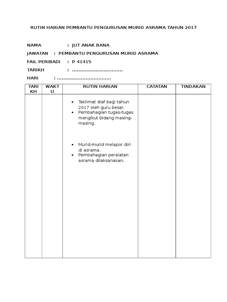Jd Pembantu Pengurusan Murid N19 from imgv2-2-f.scribdassets.com Memastikan pelaksanaan program pendidikan prasekolah. Fail meja pembantu pengurusan murid asrama? Keputusan temduga pembantu pengurusan murid n19 2019. membantu mengawasi murid semasa rehat. Berupaya membantu guru dalam sesi pdp. Fungsi bidang tugas pembantu pengurusan murid gred n19. Skim perkhidmatan pembantu pengurusan murid. Pegawai hendaklah menyenaraikan tugas harian dengan menggunakan borang yang disediakan.