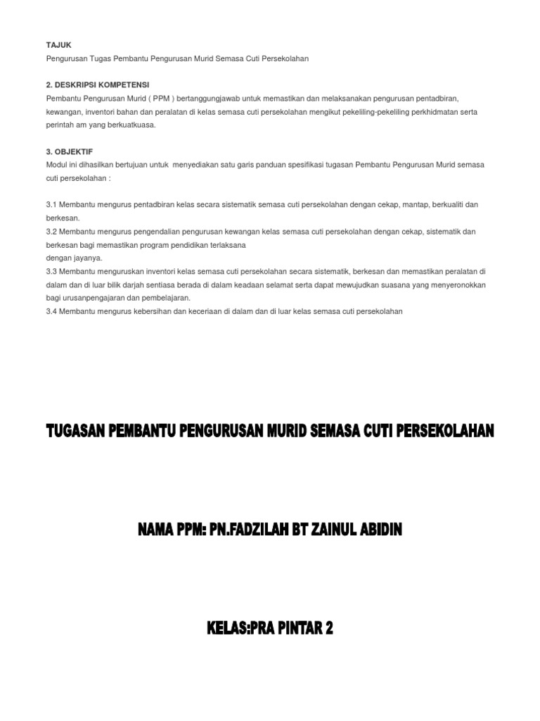 Tugas Harian Pembantu Pengurusan Murid from imgv2-1-f.scribdassets.com Berupaya membantu murid membaca, mengira, menulis dan melukis. 4.2 mengawasi murid semasa perubahan p&p/ sewaktu guru mengajar. Untuk memendekkan durasi video, hanya 10 tips yang dapat. membantu mengawasi murid semasa rehat. (b) membantu menimbulkan suasana yang selesa, selamat dan menggembirakan bagi meransang bimbingan dan asuhan. Skim perkhidmatan pembantu pengurusan murid. Temuduga pembantu pengurusan murid (ppm) n19: Bagi yang tak tahu apa itu pembantu pengurusan murid ini apa., pembantu skop tugas ppm asrama ni sy kurang pendedahan kerana sy tak ada kawan yang bekerja sebagai ppm asrama.